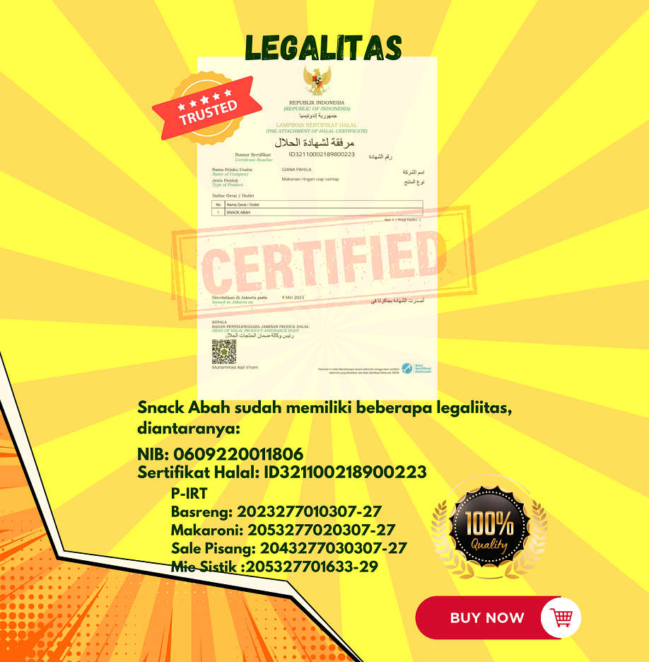 Snack abah adalah produsen snack premium khas priangan yang berasal dari Kota Cimahi. Produk best sellernya adalah basreng daun jeruk. Snack abah berawal dari bisnis rumahan kecil - kecilan. Seiring waktu dan bertambahnya customer yang puas juga pelanggan yang berubah menjadi reseller /mitra , kami memutuskan untuk mengembangkan UMKM yang berdaya saing dengan produk-produk cemilan premium yang telah memiliki Brand besar di Pasaran. Dengan rasa percaya diri terhadap kualitas produk yang dimiliki snack abah mulai membangun Home Industry di tahun 2022 . Alhamdulillah saat ini berkat kepercayaan dan permintaan customer yang terus naik snack abah sudah memiliki Rumah Produksi dan tim yang siap bekerja sepenuh hati memproduksi aneka makanan ringan yang bercita rasa enak , berkualitas dengan harga yang terjangkau.